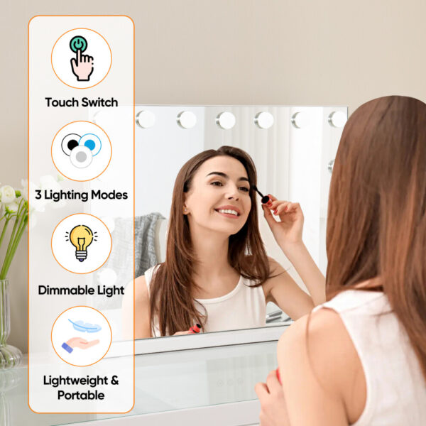 VANITY MIRROR – Our large Hollywood mirror with lights has adjustable LED lighting options to suit all your beauty needs. You can use it while getting ready for an office workday, going for an outdoor gathering with your friends, or catching up with your partner for a date. It also has a USB port to charge your phone anytime.3-LIGHTING MODES & ADJUSTABLE BRIGHTNESS – The vanity makeup mirror features 3 lighting modes, including warm, cool, and natural light with a brightness that can be adjusted from 300LUX to 1000LUX. This mirror is equipped with 15 LED bulbs and never heat up during use.TOUCH SENSITIVE CONTROL – With our LED vanity mirror, you can easily activate or deactivate the lights and modify the brightness with a touch on the screen’s sensor switch. Use the button “M” to change the light modes and the button “P” to adjust the brightness level.DETACHABLE AND WALL MOUNTED – Our makeup mirror with lights features a detachable base and two mounting holes at the back, allowing it to stand independently on a desk as a dressing tabletop mirror or be wall-mounted to save space.SIZE – The vanity mirror is sized at 57.5cm(L) x 46cm(H) with each LED bulb measuring just 3cm. It’s just the right size to ensure you can see if your makeup matches your outfit without being too small, and it’s compact enough to avoid taking up excessive space on your dressing table.15 LED Light Hollywood Make Up Mirror Tabletop Vanity Mirror DescriptionOur vanity mirror boasts 15 dimmable LED bulbs and offers three lighting modes, allowing a seamless transition between cold, natural, and warm light settings. Its generous size renders it suitable for a variety of settings, including bedrooms, dressing rooms, cosmetic studios, or beauty salons, ensuring optimal illumination for all your grooming needs.Featuring smart touch controls, our LED vanity mirror provides intuitive operation. Using the central button to power on or off, tapping the left “”M”” button switches between light settings while a long press of the right “”P”” button adjusts brightness levels to meet your specific makeup lighting requirements.This large vanity mirror with lights offers two installation options to accommodate different spaces. It includes a detachable base and two hanging holes, allowing for either desktop placement for standalone use or wall mounting to conserve table space. The mirror also features an integrated USB charging port on its right side, providing added convenience for charging your devices while you prepare for the day. This Hollywood vanity mirror allows you to effortlessly view your entire face at once, ensuring your makeup, jewellery, and clothing are coordinated perfectly.VANITY MIRROR -Our large Hollywood mirror with lights has adjustable LED lighting options to suit all your beauty needs. You can use it while getting ready for an office workday, going for an outdoor gathering with your friends, or catching up with your partner for a date. It also has a USB port to charge your phone anytime.3-LIGHTING MODES & ADJUSTABLE BRIGHTNESS -The vanity makeup mirror features 3 lighting modes, including warm, cool, and natural light with a brightness that can be adjusted from 300LUX to 1000LUX. This mirror is equipped with 15 LED bulbs and never heat up during use.TOUCH SENSITIVE CONTROL -With our LED vanity mirror, you can easily activate or deactivate the lights and modify the brightness with a touch on the screen’s sensor switch. Use the button “M” to change the light modes and the button “P” to adjust the brightness level.DETACHABLE AND WALL MOUNTED -Our makeup mirror with lights features a detachable base and two mounting holes at the back, allowing it to stand independently on a desk as a dressing tabletop mirror or be wall-mounted to save space.SIZE -The vanity mirror is sized at 57.5cm(L) x 46cm(H) with each LED bulb measuring just 3cm. It’s just the right size to ensure you can see if your makeup matches your outfit without being too small, and it’s compact enough to avoid taking up excessive space on your dressing table.FeaturesColour:SilverType:Wall MirrorShape:RectangularMounting:Wall MountedFeatures:LED Lights, Hollywood LightsFrame:With FrameProduct TagsVanity