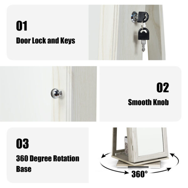 3-in-1 Mirror Jewelry Armoire: Enjoying the benefits of jewelry armoire, mirror and storage shelf all in one, this freestanding jewelry cabinet will give you endless fun of dressing up. A full length mirror that made of premium glass offering you a head-to-toe view of your outfit in real image. You can see the effect of different jewelry combinations as you try them on.Keep All Your Jewelry Organized: The jewelry armoire contains 6 lined earring shelves that including 120 earring slots and 54 earring holes, 96 ring slots, 24 necklace hooks, one bracelet bar, 5 storage racks, 2 dust-proof storage pockets and 3 acrylic storage boxes which provides plenty storage space and keeps all the jewelry well organized.360 Degree Rotating Base: Enjoying with the 360 degree rotating base, the mirrored jewelry organizer is more flexible to meet your different needs. 360 revolving angle not only help find your essentials easily, but also give you a proper position to look at yourself in the mirror.Stable and Durable Frame: Made of premium MDF material, this jewelry organizer is very durable to use. Each panel is carefully selected and stable square base enhances stability. There are three tier shelves under the jewelry cabinet to store your bag or other items, and they can also make the jewelry organizer more stable.Key lockable Design for Privacy Storage: Our free standing jewel armoire is lockable. So you can keep the private storage of your jewelry. Meanwhile, there are high-grade velvet liner inside to prevent your jewelry from being scuffed and scratched.360 Rotating Mirrored Jewelry Cabinet Free Standing Jewelry Armoire DescriptionOur jewelry cabinet is the perfect companion for any woman with a rich collection of jewelry.This 360 degree rotating jewelry cabinet keeps all your jewelry off drawers and safes and stores them in one place. With its ultra-large storage capacity including 120 earring slots and 54 earring holes, 96 ring slots, 24 necklace hooks, one bracelet bar, 5 storage racks, 2 dust-proof storage pockets, 3 acrylic storage boxes, you can put all your collections in the cabinet. And the lockable design helps keep your jewelry secure. The full length mirror offers you a head-to-toe view of your outfit. With 360 degree rotating base, you can do some makeup with easy access to your jewelry and cosmetics. Made of durable P2 MDF, this free standing jewelry armoire ensures long term use. This mirrored jewelry armoire will add a sophisticated look to your room.Features:120 earring slots for ample earring storageMade of high-quality P2 MDF for long term useLockable design ensures the safety of your propertyPractical jewelry organizer with luxurious appearanceSoft velvet inside protects your jewelry from scratchingFull length mirror offers a head-to-toe view of your outfitBack 3-tier shelves provide with additional storage space360 degree rotating base makes convenience for finding items30 heavy anti-rust hooks prevent jewelry from tangling together5 storage shelves perfect for perfume, glasses and other cosmeticsSpecifications:Color: WhiteMaterial: P2 MDF + MirrorNet Weight: 19 kgOverall Dimension: 39cm (L) x 39cm (W) x 161cm (H)External Mirror Size: 151cm (L) x 37cm(W)Internal Mirror Size: 34cm(L) x 24cm(W)Weight Capacity of Each Shelf: 5 kgPackage includes?1 X Jewelry Cabinet1 X User’s ManualFeaturesColour:WhiteType:Free-Standing MirrorShape:RectangularMounting:Free StandingFeatures:With StorageFrame:With FrameProduct TagsMirrored