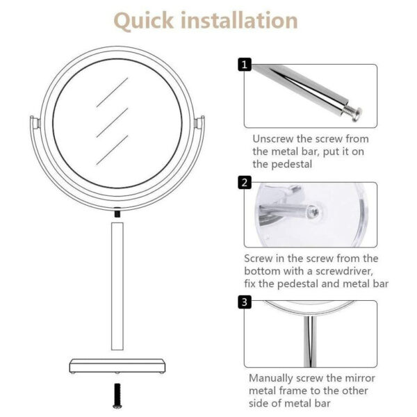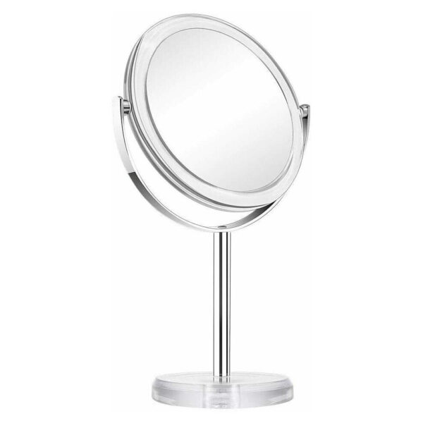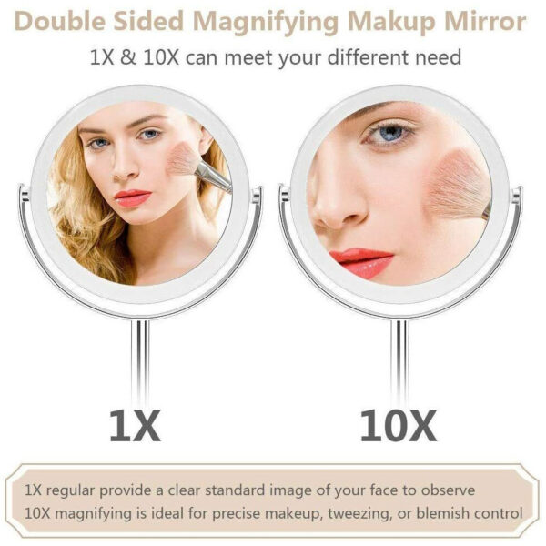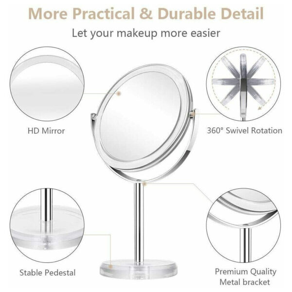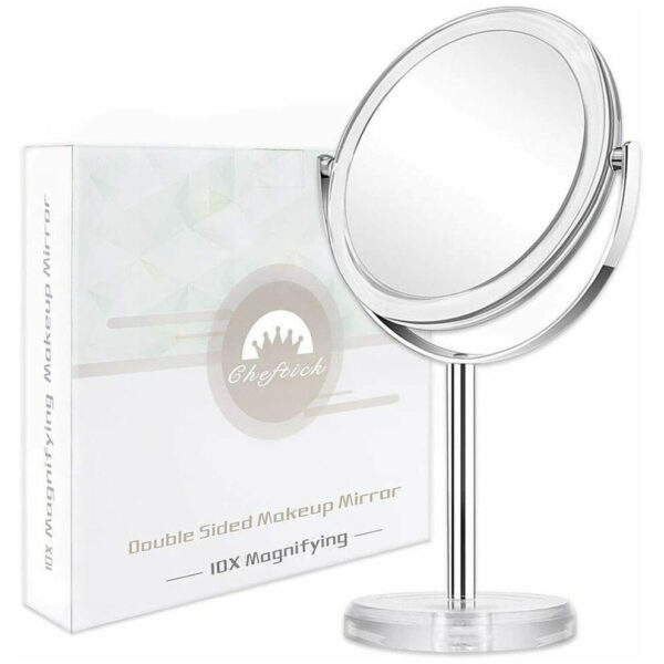 Double Sided Magnifying Makeup Mirror, 1X & 10X Magnification DescriptionDouble Sided Mirror: One side 1X magnification is ideal for viewing whole face looking, the other side is high definition of 10X magnification for catching makeup details.360 Degree Swivel Rotation: This mirror can be fixed to 360 degrees and stably stay at any angle, easy for viewing as personal preference.High Definition: Our makeup mirror made of high quality optical glass, presents high definition and excellent reflection.Perfect Size: This 7 inch diameter and 12 inch tall tabletop mirror provides a wide view, you can see yourself more clearly.Detachable Structure: This compact mirror features a detachable base and mirror face, easy to pack and move wherever you want. Perfect for home use and traveling.Cheftick Double Sided Makeup Mirror, magnify your beauty with our Magnifying Makeup Mirror.Why choose us?-Double Sided with 1X & 10X MagnificationHigh Definition of 1X & 10X side, perfect for viewing whole face looking and catching makeup details. Create your beauty without miss any details.-Detachable StructureThis mirror have detachable base and mirror face, easy to pack and move wherever you want.-360 Degree RotationThis mirror can be rotate and stably stay at any angle for easy viewing as you like, give you the best viewing experience.-Perfect SizeMirror has 12 inch tall and 7 inch diameter, which is larger than most similar mirror, provides a clear wide view, you can see yourself more clearly.-Stylish DesignUsing super transparent acrylic and metal frame, exquisite and stylish, suitable for a variety of style, best as gifts and decoration.Package include:1 * 1X & 10X Magnification Mirror1 * Instructions1 * Microfiber Cleaning ClothFeaturesColour:WhiteType:Dressing Table MirrorShape:RoundMounting:Table TopProduct TagsDouble Sided, 10x