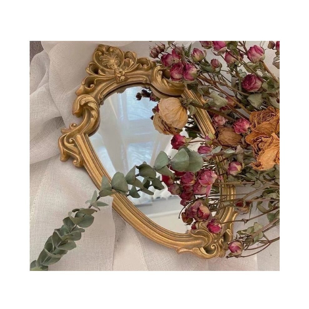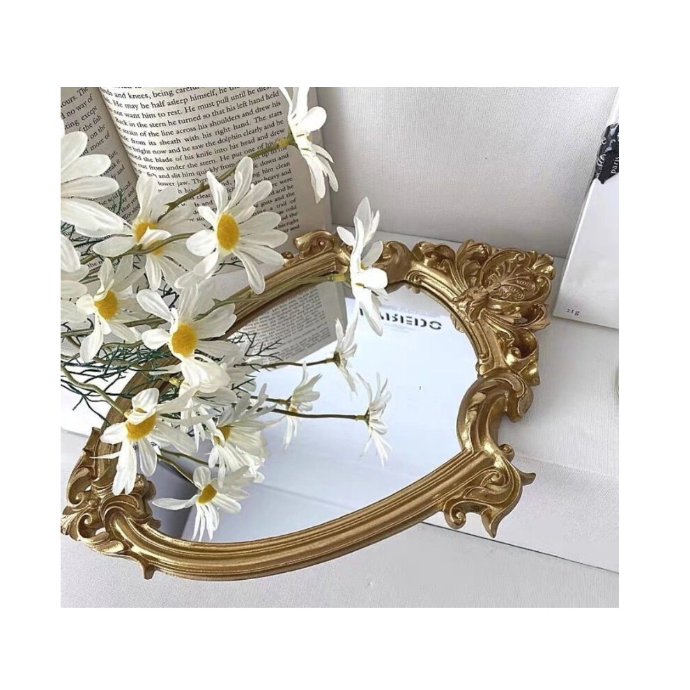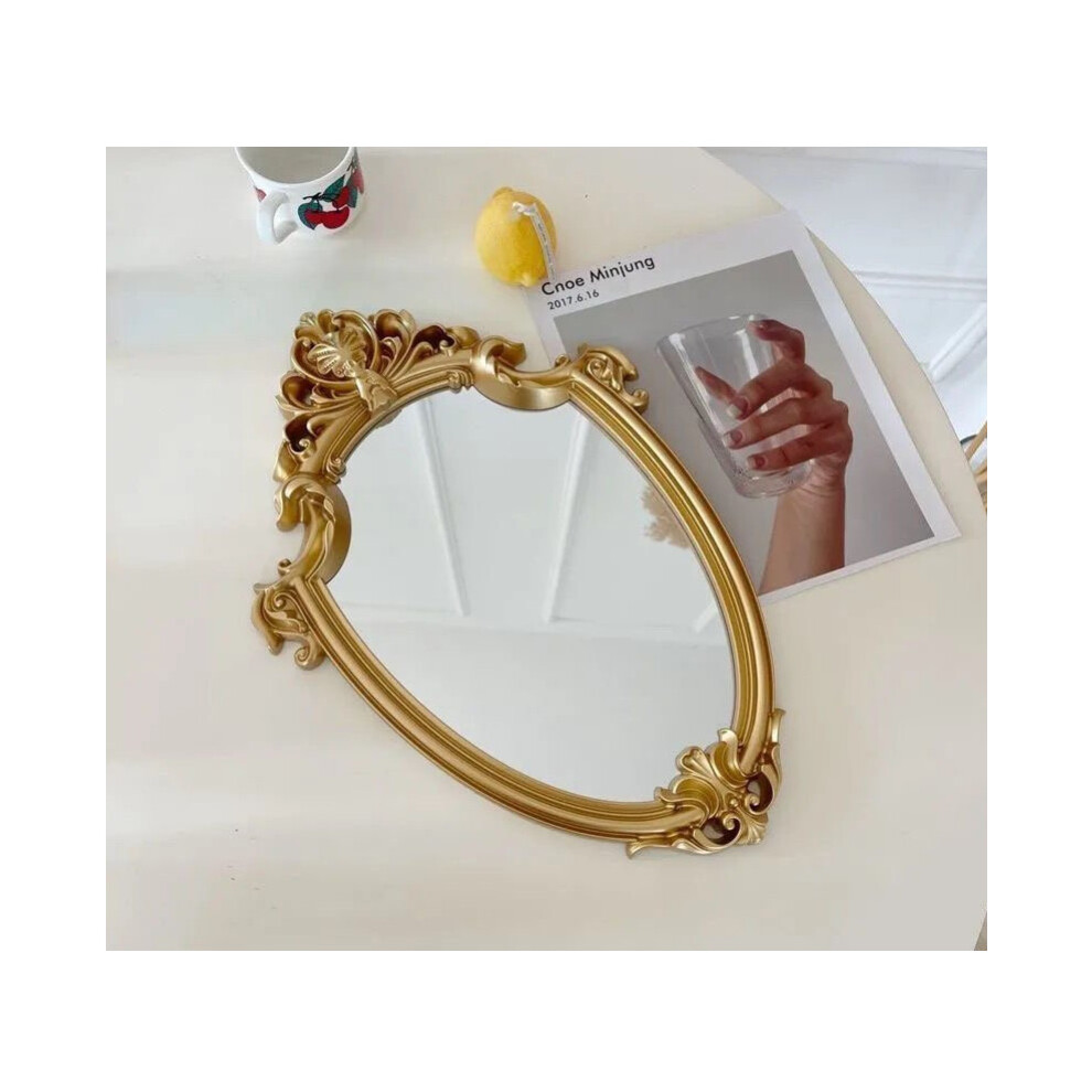 French retro Mirror palace relief mirror makeup mirror DescriptionName: retro vanity mirrorMaterial: ResinSize: 23x33cmWeight: 700gFeaturesColour:GoldType:Free-Standing MirrorMounting:Table TopFeatures:NoneMaterial:GlassFrame:With Frame