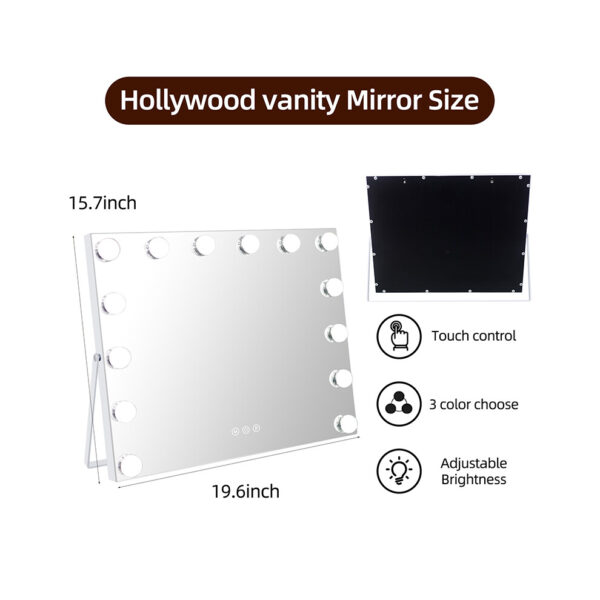 3 Dimmable Light Colour ModesLED bulbs can light for more than 50,000 hours.USB Output Charging Port; Non-Installation RequiredLarge Vanity Mirror; 10X Magnifying MirrorSturdy and stable metal bracketHollywood Vanity Mirror 14 Dimmable LED Bulbs 50x42cm Touch Screen DescriptionWe focus on providing customers with high-quality vanity makeup mirror with LED light products. We strive of simple, stylish and multifunctional designs that can improve your quality of life. Light makes you charming. Mirror reflects our life, improve people’s happiness in life. Exquisite life is actually an obsession with beauty.Here’s Dream Vanity Mirror for Your Bedroom.After watching the old 1950’s black and white movies with the beautiful actress’s sat in front of them applying their lipstick, having a ‘Hollywood vanity mirror’ is one of those things every girl have always wanted. Now here is a more professional Hollywood makeup mirror for you. It lights up and illuminates your face in warm light or daylight or cool light. You know this is the dream makeup mirror for your vanity desk!FeaturesColour:WhiteType:Dressing Table MirrorShape:RectangularMounting:Table TopFeatures:Hollywood LightsMaterial:MetalFrame:With FrameProduct TagsVanity