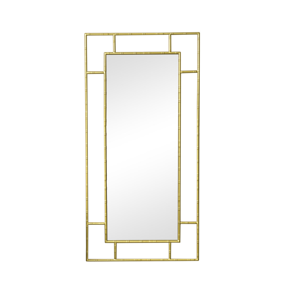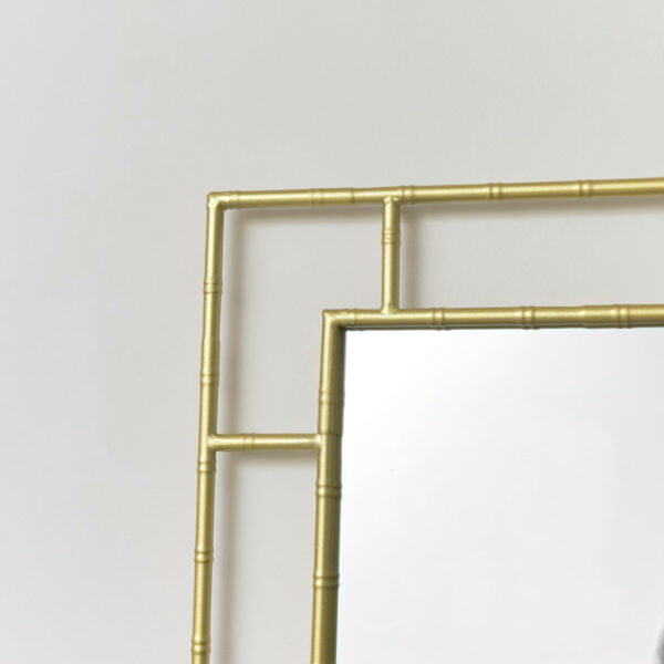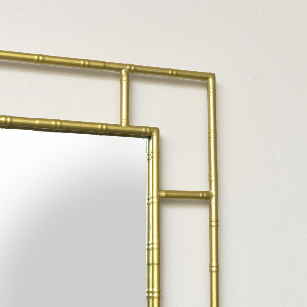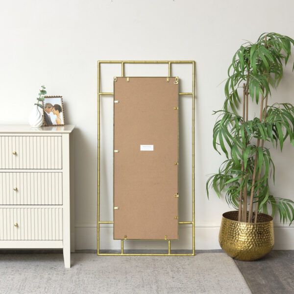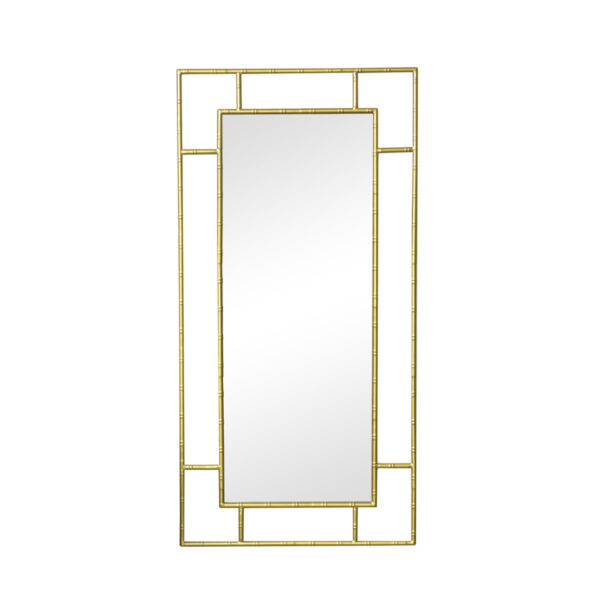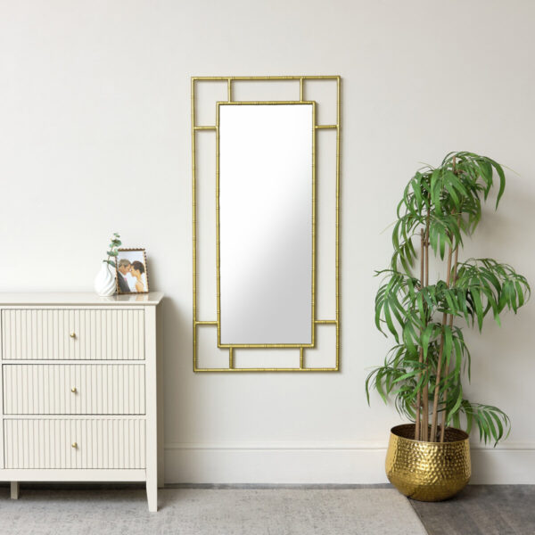 Part of a large collection of wall mirrors available in a wide variety of colours, styles and designs.Want to see more items? Browse our full range of Mirrors for more design options.Large Gold Framed Wall Mirror 120cm x 60cm DescriptionThis Large Gold Bamboo Framed Wall Mirror 120cm x 60cm is a stylish, eye-catching wall mirror, perfect for adding a touch of glamour to any room. Made of metal, glass and wood this mirror has a bamboo inspired metal frame and a yellow gold finish.Ideal for placing in a hallway, bedroom or living room space. This mirror could easily blend into luxurious, eclectic or vintage inspired spaces due to its unique design and gold finish.This mirror can be wall mounted via hooks on the back. It can be mounted both vertically and horizontally.Part of a large collection of wall mirrors available in a wide variety of colours, styles and designs.Want to see more items? Browse our full range of Mirrors for more design options.Colour: GoldFinish: GoldMaterial(s): Metal, glass, wood60cm x 120cm x 3cm (width x height x depth)Can be wall mounted horizontal and verticalProduct TagsLarge, 60cm, Wall Mirror