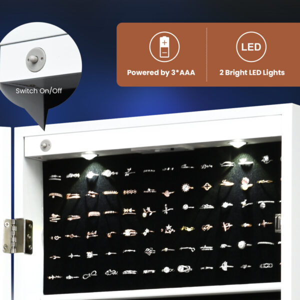 Multipurpose Jewelry Cabinet: This jewelry cabinet comes with an exterior dressing mirror and an interior oversized storage cabinet, allowing you to select jewelry while looking in the mirror. The full-length mirror features high definition without distortion, which easily reflects your outfit from head to toe.Numerous Storage Options: Featuring large storage capacity, including 108 earring slots, 36 earring holes, 1 hanging rod, 24 bracelet hooks, 78 ring slots, 12 necklace hooks, 5 shelves, 2 bottom drawers, the jewelry armoire stores your jewelry orderly and prevents them from tangling or twisting together.Internal 2 Bright LED Lights: There are 2 bright LED lights inside. After opening the door, the LED lights will switch on automatically, which illuminates internal accessories. Even at night or in dim environment, you can see the jewelry clearly. Note: It needs 3 AAA batteries (Not Included).High Quality & Lockable Design: Made of premium MDF board, the jewelry cabinet offers longtime use. Velvet liner protects your jewelry from scuffs and scratches. Equipped with magnetic device, a lock and 2 keys, the jewelry locker is easy to open and close, and ensures that valuable items are not lost.Door/Wall Mounted Installation: Just use the height-adjustable hooks provided and hang this cabinet over the door frame. Or you can also use the screws and double-side tape to fasten it to a solid wall. No matter where it is installed, this simple jewelry cabinet will add beauty to your room and maximize your space.Mirrored Jewelry Cabinet w/Full Length Mirror Lights Wall/Door Mounted DescriptionDescription:Say goodbye to rummaging through drawers and shelves for your favorite jewelry. This stylish jewelry cabinet features earring slots, stud holes, ring slots, necklace hooks and bracelet bars to keep all your jewelry neat and organized, making it easy to pick the perfect piece. Inner bright led lights allow you to see the accessories clearly even in a dim environment. With the full-length mirror, you can check your makeup and jewelry at any time, and your daily beauty routine will quickly be done before going out or attending an event.Features:Multipurpose jewelry cabinet organizer is also a dressing mirrorProvides large storage space for jewelry, makeup and accessoriesFull-length mirror helps check outfit from head to toeBuilt-in 2 LED lights will illuminate the interior accessories clearlyHigh-quality MDF board frame is durable and not easy to deformComes with a lock and 2 keys to keep your valuable jewelry safeEasy installation over the door or on the wall with mounting kitSpecifications:Color: WhiteMaterial: MDF, Glass, VelvetType: Door/Wall MountedProduct Dimensions: 37 x 9.5 x 108cm (L x W x H)Mirror Size: 28 x 101cm (L x H)Battery: 3*AAA Batteries (Not Included)Net Weight: 9kgPackage Includes?1 x Jewelry Cabinet2 x Hanging Hooks1 x User’s ManualFeaturesColour:WhiteType:Full Length MirrorShape:RectangularMounting:Wall MountedFeatures:LED Lights, With StorageFrame:With FrameProduct TagsMirrored