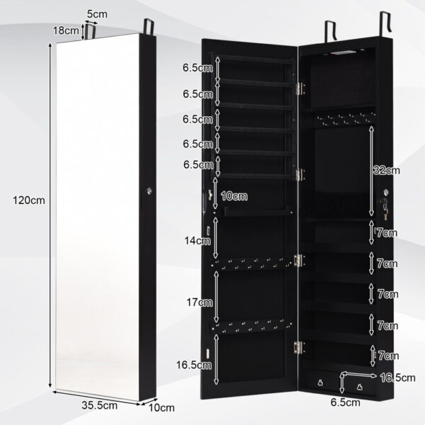Keep Various Jewelry Organized: With 120 earring slots and 36 earring hole, 36 hooks for bracelets and necklaces, 98 ring slots, storage pouch, 5 shelves and 2 drawers, this mirror jewelry cabinet perfectly stores various jewelries. Besides, the partitioned design ensures tidy organization and avoids tangle.Full-length Dressing Mirror: Measuring 35.5cm x120cm(W x H), this led jewelry organizer offers large full-length mirror to let you check your look from head to toe. Moreover, mirrored design brings 2-in-1 use, and the armoire organizer is suitable for bedroom, dressing room, and many other occasions.Wall & Door Mounted Available: The mirror jewelry armoire can be hung on the door with the provided hooks, greatly saving space. Additionally, the complete kits allow you to install the makeup armoire on the wall as you like. Coming with easy-to-follow manual, the assembly can be completed quickly.Lockable Cabinet with Auto Light: The package includes 2 keys to allow you to lock the door, preventing dust, falling and improving security. The led lights(powered by 2 AA batteries, not included)turn on and off automatically with the door, letting your jewelry shining and helping you easily get the exact jewelry.Quality Material & Easy Clean-up: The frame is made of high quality MDF, ensuring excellent sturdiness and durability to hold your treasures and last for long time. The soft velvet lining effectively prevents friction and collision, providing protection for jewelry. The glass mirror is easy to be cleaned to save hassle.Wall-mounted Jewelry Storage Cabinet Door Hanging Jewelry Armoire w/ Full Mirror DescriptionDescription:Solve your jewelry storage problem with our mirror jewelry cabinet.This mirror jewelry cabinet provides large capacity to store various jewelries well organized and offers led lights to help you sort and get your jewelry. Moreover, comes with lock and keys to add safety and the inner soft velvet brings extra protection. This armoire organizer is perfect for different situations and allows you to hang it on the wall and door to fit your space. You can check your makeup before going out with the large full-screen mirror.Get one for more convenient daily beauty routine.Features:Provide plenty of room for earring, necklaces, braceletsLockable design to prevent accidental opening and improve safety2 LED lights helps you conveniently find jewelry as you wantFull-length mirror offers you a head-to-toe view of your outfitCan be hung on the door and wall according to your needsPerfectly match with different decoration styles with its lookCrafted with premium material for long time serviceSpecifications:Colour: BlackMaterial: MDF+ GlassOverall Dimensions: 35.5cm x 10cm x 120cm (L x W x H)Net weight: 10kgPackage includes?1 x Mirror Jewelry Cabinet2 x Hanging Hook1 x Pack of Accessories1 x User GuideFeaturesColour:BlackType:Wall MirrorShape:RectangularMounting:Wall MountedFeatures:Infinity Mirror, LED Lights, With StorageMaterial:WoodFrame:With FrameProduct TagsHanging